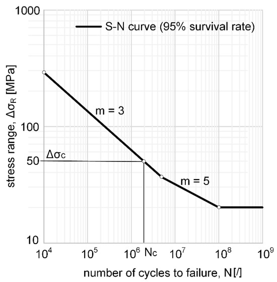 In the Eurocode 3 classification, tension-loaded bolts belong to the detail category 50. The S-N curve for detail 50 (ΔσC = 50 MPa) is shown in Figure 17 and described by Equation (13). The slope of the curve is m = 3 up to 106 cycles, and m = 5 above 106 cycles. The detail applies to both cut and rolled threads.