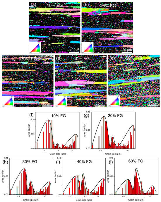 Trimodal grain structure of 10% FG, 20% FG, 30% FG, 40% FG and 60% FG. (a–e) Trimodal grains morphology characterized by EBSD. (f–j) Corresponding statistical results of grain size distribution.