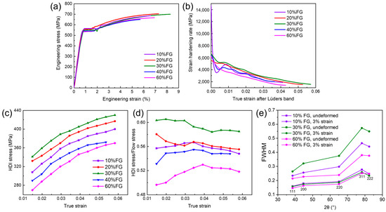 Tensile behaviors of trimodal composites with different content of FG. (a) Engineering stress–strain curves. (b) Strain-hardening curves. (c) HDI stress evolution during plastic deformation. (d) The ratio of HDI stress to flow stress during plastic deformation. (e) The increase in FWHM of 10% FG, 30% FG and 60% FG after strain of 3%.