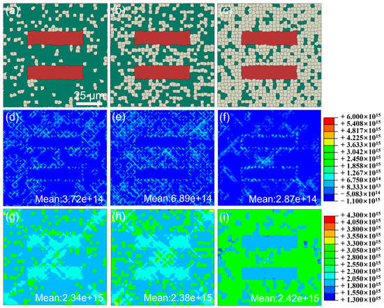 Distribution of GNDs and SSDs after strain of 4%. (a–c) RVE of 10% FG, 30% FG and 60% FG. (d–f) Distribution of GNDs in 10% FG, 30% FG and 60% FG. (g–i) Distribution of SSDs in 10% FG, 30% FG and 60% FG.