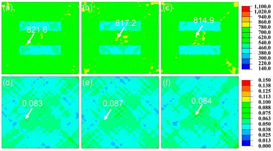 Distribution of stress and strain after strain of 4%. (a–c) Distribution of stress in 10% FG, 30% FG and 60% FG. (d–f) Distribution of strain in 10% FG, 30% FG and 60% FG.