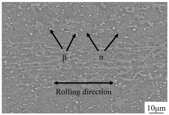 The experimental material is 50 mm × 50 mm × 1 mm rolled TC4 titanium alloy sheet; its chemical composition is shown in Table 1, and its microstructure is shown in Figure 1. It can be seen from the figure that the α phase is the matrix phase, and the β phase is distributed at the grain boundary of the α phase.