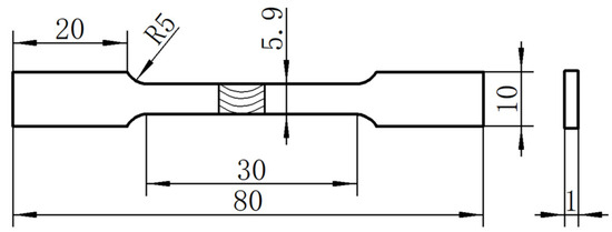 After the welding is completed, wire cutting is used to cut and prepare the samples for standby using metallography, XRD, hardness, and other specimens. The following steps are required for preparing XRD specimens: grind the cut specimens successively with water abrasive paper of different particle sizes (600#, 800#, 1000#, 1200#, 1500#, and 2000#), mechanically polish the specimens to a mirror finish using nano-silicon dioxide polishing solution (50 nm) (Nanos Precision Machinery Technology Co., Ltd., Shenzhen, China), then place them in an ultrasonic cleaner and use anhydrous ethanol to clean and dry the specimens for standby, without any etching treatment. A D/max-2500/PC X-ray diffraction analyzer (XRD, Rigaku Corporation, Tokyo, Japan) is employed to investigate the phase composition of the weld (scanning speed of 8°/min; scanning range of 20–90°). The equilibrium phase diagram of TC4 titanium alloy is calculated using Jmat-pro software (Public Release Version 7.0.0, Sente Software Ltd., Surrey, UK). When preparing the metallographic specimen, the sample was inlaid with inlaying material, and the specimen was ground and polished after inlaying. The grinding and polishing process was consistent with the above process, and then the chemical etching was carried out with Kroll reagent (the volume ratio of HF, HNO3, and H2O was 2:3:10), and the etching time was 5–7 s. A Zeiss Axio Vert.A1 inverted metallographic microscope (Carl Zeiss AG, Oberkochen, Germany) is used to observe the metallographic structure of the weld. A Zeiss Sigma500 field emission scanning electron microscope (SEM, Carl Zeiss AG, Oberkochen, Germany) is adopted to observe and analyze the microstructure of the samples. The grain size distribution was calculated using ImageJ software (ImageJ 1.53q, National Institutes of Health, Bethesda, MD, USA). After the above test is completed, the corroded layer of the specimen is thrown off with a polishing machine to a scratch-free state, cleaned with alcohol solution, and dried for use. An MHVD-1000IS image analysis multi-functional digital microhardness tester (Shanghai Jujing Precision Instrument Manufacturing Co., Ltd., Shanghai, China) is used to measure the microhardness of the specimen (loading force of 200 N, duration of 10 s). The hardness of the weld (base metal → weld → base metal) is tested every 0.15 mm along the horizontal direction, and a hardness distribution diagram is plotted. Room temperature tensile specimens are cut from the samples using wire cutting and ground to 2000# with water abrasive paper to remove surface wire cutting marks and impurities. A CMT5305 computer-controlled electronic universal testing machine (MTS Systems (China) Co., Ltd., Shanghai, China) is used to test the room temperature tensile properties of the tensile specimens, and the tensile test data is plotted into a stress–strain curve. The maximum tensile strength (σb) and the elongation (δ) after fracture can be obtained from this curve. A Zeiss Sigma500 field emission scanning electron microscope (SEM) is employed to analyze the fracture morphology of the specimens after the tensile test. The welding process parameters are listed in Table 2, and the dimensions of the tensile specimens are shown in Figure 3.