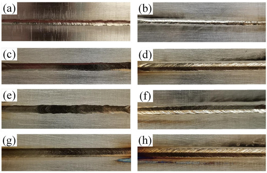 Weld morphology: (a) A = 0.2 mm, face of weld; (b) A = 0.2 mm, back of weld; (c) A = 1 mm, face of weld; (d) A = 1 mm, back of weld; (e) A = 2 mm, face of weld; (f) A = 2 mm, back of weld; (g) A = 3 mm, face of weld; (h) A = 3 mm, back of weld.