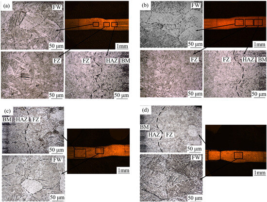 Figure 5 shows the microstructure of the weld seams under different oscillating amplitudes. Through Figure 5, we can gain a deep understanding of the mechanism of how the oscillating amplitude affects the morphology of the weld seam, the fusion zone, and the heat-affected zone. As the oscillating amplitude increased, the overall width of the weld seam tended to increase, as the oscillating welding increased the duration of laser interaction with the material surface, thereby enhancing local heat input. As the oscillating amplitude rose, the high-temperature residence time extended, and the high-temperature zone broadeneds, resulting in a wider fusion zone of the weld seam. Meanwhile, oscillating welding significantly impacted the boundary between the heat-affected zone and the fusion zone of the weld seam. Compared to linear laser welding, the adoption of oscillating welding transformed the boundary between the two zones from a curve with a wider upper part and a narrower lower part into an irregular curve with little difference in the upper and lower positions. This change is mainly attributed to the alterations in fluid dynamics inside the weld pool caused by the laser oscillation, which further affects the morphology of the heat-affected zone and the fusion zone [16,17,18]. In the microstructure of the fusion zone of the weld seam, the morphology and distribution of acicular martensite also changed with the increase in oscillating amplitude. As can be seen from the figure, the collapse of the weld when A = 3 was mainly due to excessive welding heat input. When the oscillating amplitude was 1 mm, there was a relatively large distribution of columnar crystals in the fusion zone of the weld seam, and the acicular martensite was relatively fine. This is because, under such parameters, the laser beam oscillates to stir the weld pool, promoting rapid cooling and thus contributing to grain refinement. However, when the oscillating amplitude is excessively large, such as in the case of A = 3 mm shown in Figure 5d, overburning occurs in the weld seam, leading to dendrite-like white structures inside the grains and coarsened acicular martensite. This indicates that excessive heat input results in grain growth and coarsening, thereby affecting the mechanical properties of the weld seam. Figure 5 reveals the significant impact of oscillating amplitude on the microstructure of the weld seam. By reasonably adjusting the oscillating amplitude, fine control over the morphology of the weld seam, the heat-affected zone, and the microstructure of the fusion zone can be achieved, resulting in weld joints with excellent performance.