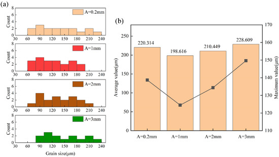 Figure 6 shows the grain size distribution in the fusion zone of welds under different oscillation amplitudes, as well as how the maximum and average grain sizes vary with the oscillation amplitudes. Carefully observing Figure 6 and combining it with the content of Figure 5, we can see that the change in oscillation amplitude had a significant impact on the grain size and its distribution in the microstructure of the fusion zone. The average grain sizes in the fusion zone were 138.7 μm, 124.5.5 μm, 136.1 μm, and 153.2 μm when A = 0.2 mm, A = 1 mm, A = 2 mm, and A = 3 mm, respectively. When the oscillation amplitude A was 1 mm, the grain size in the fusion zone was mainly distributed within the range of 80–200 μm, and the average grain size was relatively small. This is because, under this oscillation parameter, the molten pool undergoes repeated heating and cooling cycles during the oscillation process, forming a complex thermal cycle that promotes the recrystallization and recrystallization of grains, effectively refining the grains and maintaining the grain size at a relatively small level. As the oscillation amplitude increased, the distribution range of grain sizes widened, and the average grain size also increased [15,19,20]. This is because a larger oscillation amplitude may cause the molten pool to undergo greater mechanical disturbance and heat input during the oscillation process. Although this helps to homogenize the fusion zone, it may also hinder the grain refinement mechanism to a certain extent, resulting in a larger number of large-sized grains and a more dispersed distribution.