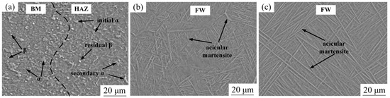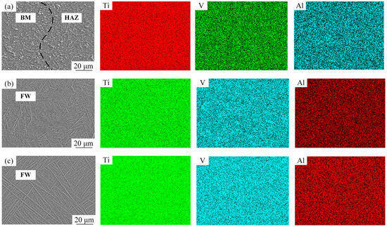 Figure 7 shows the microstructure of the weld when A = 1 mm. Figure 7a–c shows the microstructures from the base metal to the weld center. From the figure, we can see the morphology and distribution of the acicular martensite from the base metal to the weld center. Combined with Figure 8 and Figure 9, the composition of the weld microstructure can be analyzed. In the heat-affected zone of the weld, due to the effect of the welding heat cycle, some α and β phases underwent a transformation, but the transformation was incomplete, and there were still original α phases and residual β phases. The microstructure at the weld center was composed entirely of acicular martensite, indicating that the region has been subjected to sufficiently high heat input, and the base metal microstructure has been completely transformed into acicular α′ martensite. The surface analysis of different areas of the weld was carried out, as shown in Figure 8. As can be seen from the figure, the element distribution of the weld was very uniform, and the uniform element distribution could ensure that the mechanical properties of the weld area (such as strength, toughness, hardness, etc.) were more consistent with the base material, avoiding the weakness caused by local performance differences.