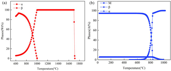 Figure 8 shows the equilibrium phase diagram of TC4 titanium alloy calculated using Jmat-pro, which can predict the phases in the weld seam of TC4 titanium alloy and provide strong evidence for further determining the phases in the weld seam. In Figure 9a, we observe that during the heating process, the α phase gradually transforms into the β phase, and when the temperature rises to 984 °C, the α phase completely transforms into the β phase. This process can be expressed as initial β phase + initial α phase → high-temperature β phase. During the cooling process of the molten pool in Figure 9b, the β phase transforms into α phase and martensite. After the temperature drops to 480 °C, the β phase transformation ends, but the content of the β phase is not zero at this time, which is called the residual β phase. This process can be expressed as high-temperature β phase → secondary α phase + martensite + residual β phase. Based on the above phase transition process, the phase transition process in the fusion zone of the weld seam can be calculated as follows: under the action of the laser, the contact position of the TC4 titanium alloy sheet melts to form a molten pool. During this process, the solid phase originally based on the initial α phase disappears, forming a liquid molten pool composed of the high-temperature β phase. Then, the molten pool cools rapidly and enters the solidification process, during which the liquid molten pool (high-temperature β phase) disappears, forming a weld seam composed of martensite, secondary α phase, and a small amount of residual β phase.