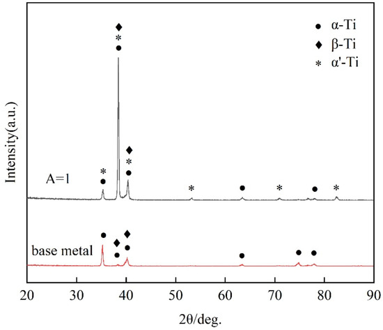 Figure 10 is a comparative XRD diagram of the cross-section of the weld seam and the base metal of TC4 titanium alloy with a laser swing amplitude of A = 1 mm. Through comparative analysis, we can clearly observe that after the application of swinging laser welding, the initial α phase in the weld seam was significantly reduced, and some peaks of the α phase disappeared while a new α′ phase emerged. This change indicates that during the laser welding process, due to the heat input of the high-energy beam and the influence of rapid cooling conditions, the microstructure of TC4 titanium alloy had undergone significant transformation [21,22,23]. Combining Figure 5 and Figure 7, we can further determine the microstructure composition of different regions of the weld seam. The fusion zone of the weld seam was mainly composed of acicular α′ martensite, a secondary α phase, and a residual β phase. In the heat-affected zone of the weld seam, the phase composition was more complex, consisting primarily of acicular α′ martensite, an initial α phase, a secondary α phase, and a residual β phase. The presence of these phases was caused by the phase transformation and microstructure evolution mechanisms during the laser welding process.