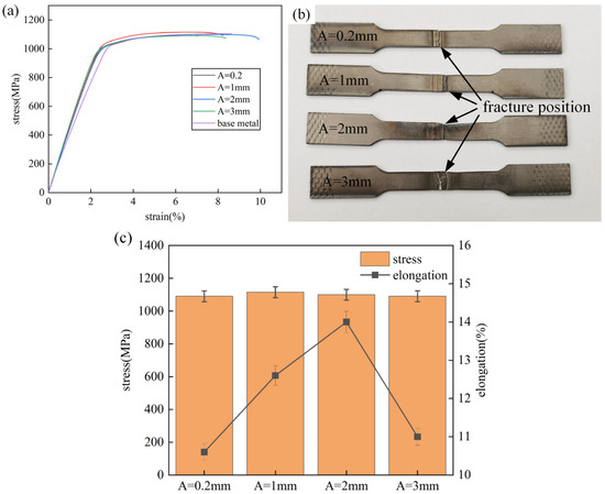 Figure 11 depicts the tensile properties of samples under different wobble amplitudes. It can be observed from the figure that the tensile strengths and post-fracture elongations of specimens with A = 0.2 mm, A = 1 mm, A = 2 mm, and A = 3 mm were 1090.4 MPa, 1115.4 MPa, 1099.5 MPa, 1090.7 MPa, and 10.6%, 12.6%, 14%, 11%, respectively. The fracture locations of tensile samples are illustrated in Figure 11b. When A = 1 mm, the tensile strength of the weld was greater than that of the base material (1100 MPa), and when A = 2 mm, the tensile strength of the weld was similar to that of the base material, and the tensile part broke at the base material under both parameters. At A = 0.2 mm, the laser wobble amplitude was relatively small, resulting in a shorter duration for the keyhole to open. As a result, gases entering the keyhole failed to escape promptly, leading to the formation of pores. The presence of pores reduced the effective bearing area of the weld seam and caused stress concentration in the surrounding tissue under load, thereby decreasing the tensile strength of the weld seam. This is also confirmed by the presence of pores in the fracture after stretching. When A = 1 mm, the size of the acicular martensite in the weld seam was smaller, which increased the dislocation density and, consequently, enhanced the material’s strength. However, the interlaced acicular martensite structure tended to induce stress concentration, thereby reducing the ductility and toughness of the weld seam. At A = 2 mm, the acicular martensite present in the weld seam provided a lower dislocation density and larger grains, indicating fewer dislocations per unit grain volume. This typically leads to slightly lower material strength but increased toughness [24,25,26]. As seen in Figure 5, when A = 3 mm, the martensite in the weld seam was excessively coarse, and there was an overburning phenomenon in the weld seam. Overburning results in significantly enlarged grains of the weld metal, thereby reducing the strength of the weld seam. Additionally, the coarse acicular martensite restricted the movement of dislocations, further reducing the ductility of the material.