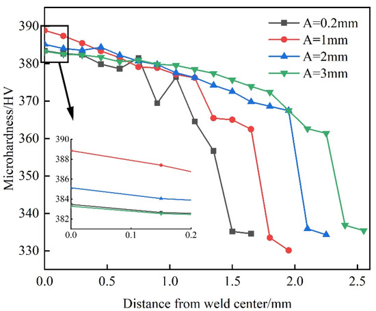 Figure 12 shows the hardness distribution from the weld center to the base metal under different swing amplitudes. As can be seen from the figure, the maximum hardness values of the weld seams at A = 0.2 mm, A = 1 mm, A = 2 mm, and A = 3 mm are 383.46 HV, 388.86 HV, 385.13 HV, and 383.28 HV, respectively. The overall hardness distribution from the weld center to the base metal shows a downward trend. As can be seen from the figure, the hardness distribution of the weld seam was irregular when A = 0.2 mm, mainly due to the presence of pores in the weld seam. The existence of pores damaged the coherence between grains inside the weld seam to a certain extent, hindered dislocation movement, and increased the local hardness of the weld seam. Therefore, although the weld seam hardness value at A = 0.2 mm was higher, its hardness source was not consistent but was affected by pores, showing an unstable distribution characteristic. As the laser swing amplitude increases, i.e., when A = 1 mm, A = 2 mm, and A = 3 mm, the maximum hardness of the weld seam shows a downward trend. When A = 1 mm, the weld seam hardness was the highest, reaching 388.86 HV, mainly due to the formation of more fine needle-like martensite in the weld seam structure at this time. These fine needle-like martensites had a larger surface area to volume ratio, significantly increasing the dislocation density, which means that the material needs to overcome higher energy during plastic deformation, making the weld seam stronger against plastic deformation. The formation of needle-like martensite leads to hindered crystal slippage [15,27,28,29]. This hindrance effect increased with the increase in dislocation density, ultimately manifesting as a significant increase in material hardness.