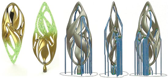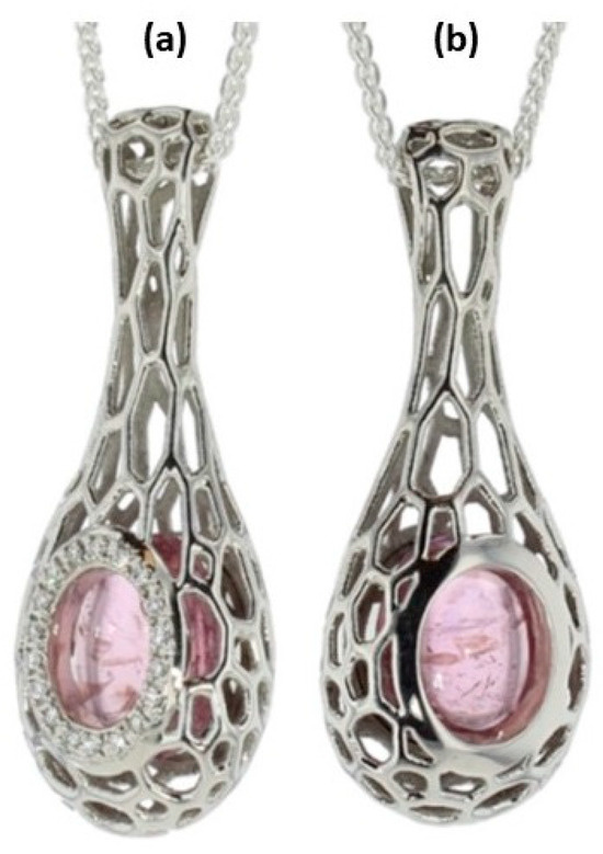 The main focus of this review is on jewelry production, to emphasize, on the basis of published work on the subject [8], the potential that these new technologies may have for the jewelry industry compared to traditional methods (TM). AM offers the advantage of allowing greater design freedom, creating innovative and complex designs that would otherwise be challenging to construct using conventional techniques [9]. This is not the only important aspect. A clear example of the potentiality of AM is presented in Figure 1, Figure 2 and Figure 3. A gold pendant piece “the Ojo” was constructed using Laser Powder Bed Fusion (L-PBF) with the help of a support structure [10]. The supporting structure for making the jewelry was designed using CAD software (Figure 1). Figure 2 reports the fabrication step (processing) of the Au jewelry while Figure 3 underlines the surface finishing that can be obtained by additional polishing treatment (post-processing) [10]. The complexity of the part and its manufactured cost are directly correlated in the current standard jewelry manufacturing process; however, by using L-PBF methods, this relationship can be greatly reduced compared to the conventional method.