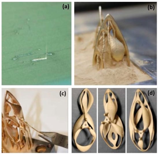 (a) Laser beam on thinly spread Au powder using the L-PBF process, (b) “the Ojo” pendant built from the Au powder bed, (c) support remotion by pliers, (d) three different pendants before mechanical finishing and polishing, Reprinted from ref. [8].