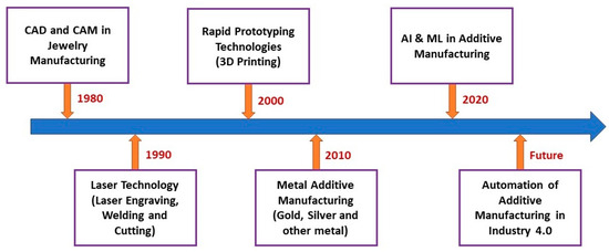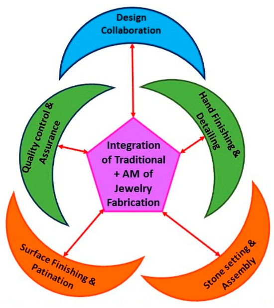Based on previous literature, this review discussed the current state of the art of AM for jewelry applications. Furthermore, the future direction of AM for Industry 4.0 jewelry manufacturing is outlined (Figure 4).
