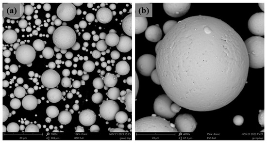 Both PM and AM technologies depend on powdered materials with well-defined properties and morphology to ensure the quality and performance of the final products. In these technologies, the powder characteristics, such as particle shape, particle size distribution, apparent and packing density, flowability, and morphology are crucial. These factors impact the powder behavior during processing, thereby affecting the mechanical properties and accuracy of the finished part. In particular, spherical particles (Figure 6) of well-controlled grain size are generally preferred due to their better flowability and packing density. To obtain these powder characteristics, gas atomization is a widely used method for producing metal powders with the desired properties for both PM and AM. In this process, molten metal is dispersed into fine droplets by a high-pressure gas stream, typically argon or nitrogen, which solidify into powder particles as they cool. Gas atomization produces highly spherical powders with controlled particle size distribution, and minimal contamination, making it a suitable technique for generating high-quality powders for these technologies [14,15].