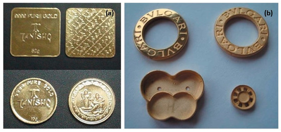 (a) Press and sinter of Tanishq pure gold coins by Titan, (b) MIM-produced 18-karat gold 3N pieces, Reprinted from ref. [19].