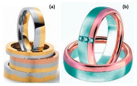 In addition to the traditional techniques, powder metallurgy (P/M) refers to the net-shape manufacturing of components using powdered metal. Various techniques within powder metallurgy, such as press and sinter (P&S), metal injection molding (MIM) and hot and cold isostatic pressing (HIP and CIP) were recently investigated [16,17]. In particular, powder metallurgical processing finds widespread applications in jewelry which show a quality comparable to cast parts. The primary advantage lies in the reduced part cost due to minimized material waste and processing expenses. Consequently, the direct application of powder metallurgy in jewelry fabrication offers significant benefits [16,17]. Peter M. Raw first presented the pioneering development of a powder metallurgical method for large-scale ring manufacturing. Initially focused on carat-gold rings and later extended to platinum, the ring fabrication process involved steps such as powder atomization, cold pressing, sintering, and rolling to achieve the desired ring dimension. The rings produced by powder metallurgy have a fine grain microstructure, which contributes to improved wear resistance and strength. The fine grain size, often observed in powder metallurgical products, was attributed to the existence of an extremely fine, sub-microscopic porosity that has the potential to stabilize grain boundaries. Consequently, the method has both economic and technical advantages, marking a significant milestone in ring manufacturing [18]. J. T. Strauss explored P/M technologies demonstrating their ability to create high-quality jewelry at reduced costs compared to conventional casting and machining processes. Despite this potential, the use of P/M in the jewelry industry has remained limited. The current status of P&S and MIM in the jewelry production industries was also examined by Titan and Hilderbrand, that employed press and sinter (P&S) and MIM techniques to fabricate Tanishq pure gold coins and 18-karat gold 3N pieces (Figure 7) [19,20]. Sintering, a heat treatment process that involves the consolidation of powdered materials under an optimized thermal cycle, offers numerous methods for seamlessly combining a variety of colors. K. Wiesner reported [21] that the sintering method has already been firmly established in the manufacturing of wedding rings (Figure 8).