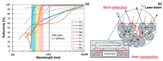 (a) Comparison of different materials reflectivity, Reprinted from ref. [23] and (b) heat absorption and reflection of powder bed by the laser beam, Reprinted from ref. [22].