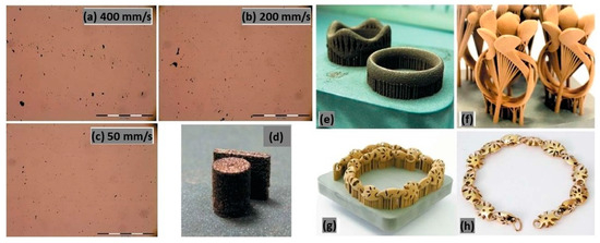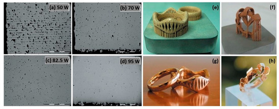 Additive manufacturing, especially L-PBF, was most suitable for fabricating gold jewelry to achieve complex and customizable designs that are otherwise too time-consuming and challenging to fabricate with the powder metallurgy method. L-PBF selectively melts the metal powder layer-by-layer to produce the bulk structure, which is guided by the 3D CAD models. Fischer-Buehner et al. fabricated 18 K yellow-gold (18 K YG) jewelry with different process parameter combinations using L-PBF. Figure 10 illustrates the impact of laser power on 18 K yellow-gold powder. The laser power was varied between 50 and 95 W, with a layer thickness of 20 μm and scanning rates ranging from 200 to 400 mm/s. In Figure 10a, it is evident that a 50 W laser power, with parameters similar to those commonly used for cobalt-chrome or steel, results in poor densification. However, the images in Figure 10b–d demonstrate that the increase in the laser power leads to an improved densification. A final laser power of 95 W yields low residual micro-porosity levels. Using the optimized parameters, the authors printed jewelry in 18 K YG as shown in Figure 10e–h. Metallographic cross sections confirm that excellent surface quality can be achieved, even with a low residual amount of microporosity [22].