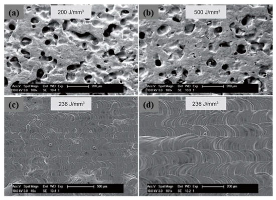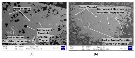 SEM images of AM 99.9% silver samples at 30 μm layer thickness with a scan speed and hatch distance of (a) 800 mm/s and 0.14 mm, and (b) 600 mm/s and 0.15 mm, Reprinted with permission from ref. [27]. 2020 Elsevier.