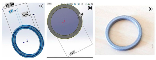 CAD geometry of the Ag ring (a,b) and the product obtained by L-PBF (c), used under CC BY 4.0 [28].