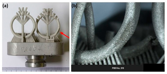 (a) Additive manufacturing of platinum ring; (b) defects of the ring shank on one side, Reprinted from ref. [32].