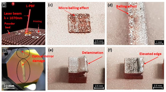 (a) L-PBF with 1070 nm wavelength, Reprinted from ref. [34], (b) damage of the optical mirror due to laser back reflection from the copper substrate and specific defects, Reprinted with permission from ref. [36], 2019 Elsevier (c) micro-balling effect, Reprinted from ref. [38], (d) balling effect, Reprinted from ref. [38], (e) delamination, Reprinted from ref. [38], (f) elevated edge, Reprinted from ref. [38].