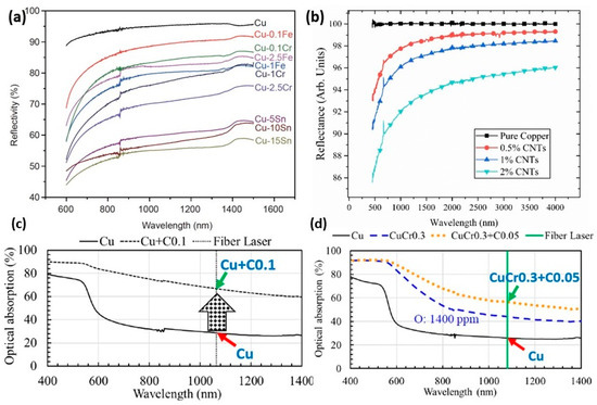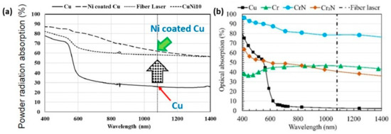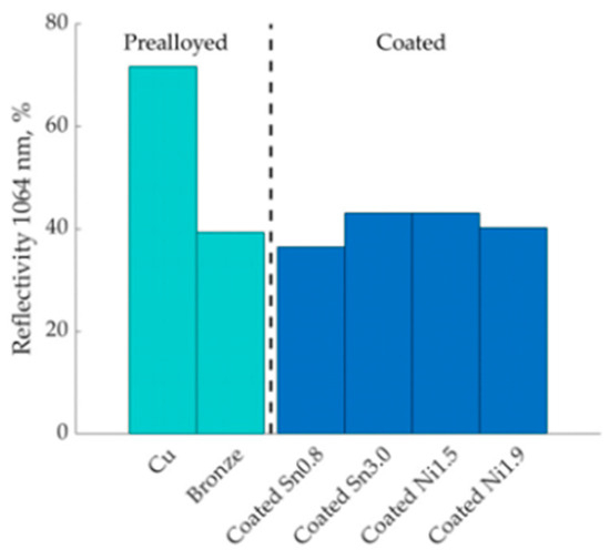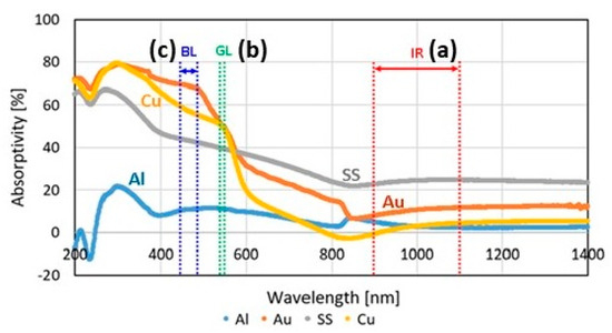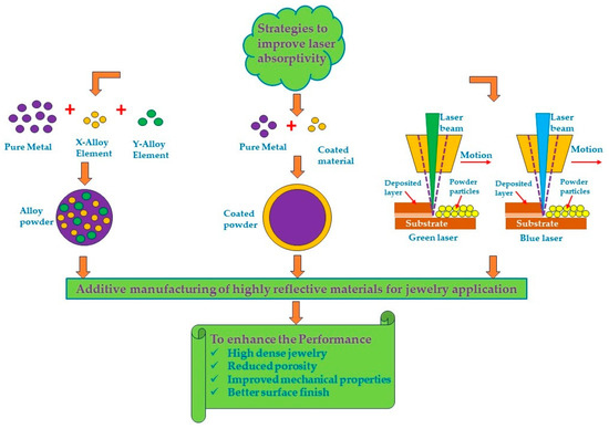The methods suggested in the bibliography to overcome these problems are covered below. These methods involve the use of various alloying elements, powder coating, or the use of low wavelength lasers to enhance the metal absorbance. Alloying elements like gallium, germanium, and silicon can reduce reflectivity and improve laser absorption, leading to better fusion and reduced porosity. Powder coating can further enhance laser energy absorption and melting efficiency. Low-wavelength lasers (i.e., green or blue lasers) provide higher absorptivity, enabling the fabrication of high-quality components with improved mechanical properties (Figure 17).