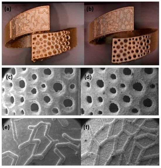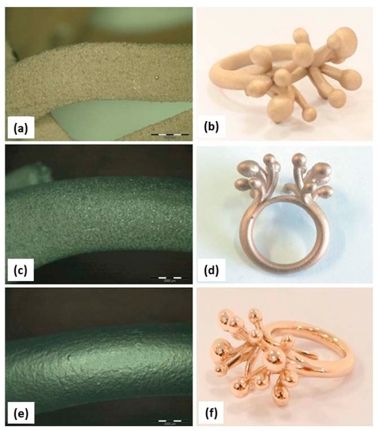 Gold alloy ring obtained by (a) standard (76.2 W, 250 mm/s, layer thickness 30 μm, 50% of overlapping) and (b) optimized parameters (65 W, 330 mm/s, layer thickness 20 μm, and 75% of overlapping); (c–f) SEM images of pave obtained using the two sets of parameter, Reprinted from ref. [47].