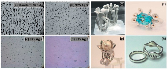 SEM images of 18 K YG (a–d) obtained by L-PBF with different laser power and (e–h) jewelry parts, Reprinted from ref. [22].