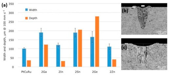 The same authors [49] demonstrated the possibility of increasing the absorption of laser radiation by adding a small concentration of semiconductor elements (Si, Ge) that increase the electrical resistivity and can reduce the thermal conductivity of the red gold alloy, thus improving the L-PBF behavior. The presence of semiconductor elements reduces the porosity and improves the process stability [49,50].