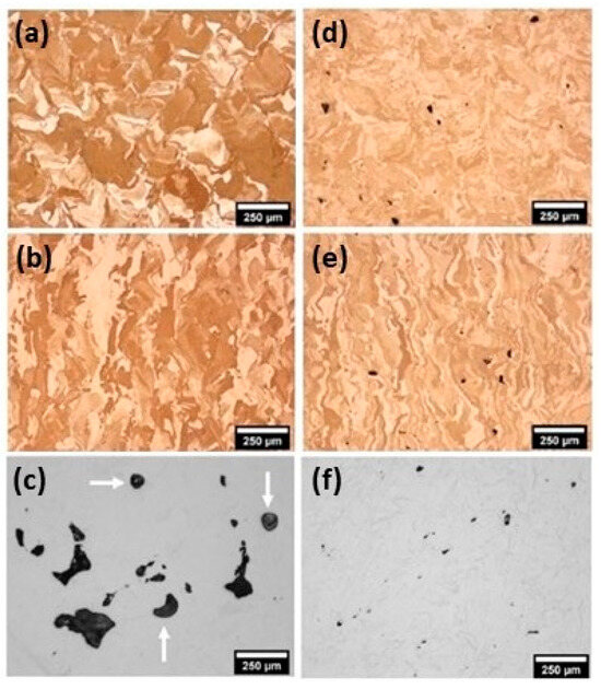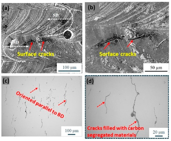The fabrication of pure copper via laser-based additive manufacturing has huge challenges due to the high reflectivity, high thermal conductivity, low laser absorption, high electrical conductivity, and oxidation sensitivity of copper with the 1070 nm wavelength infrared laser (Figure 16a) [34,35]. Due to the low absorption behavior of pure copper, the fabricated parts, in general, exhibit various defects such as low density, high porosity, balling effect, layer delamination, and crack formation (Figure 16c–f) [36,37]. Also, the high reflectivity of copper substrate can lead to damage in the optical mirror [38], as shown in Figure 16b [39,40]. The high reflectivity and thermal conductivity of copper require the use of higher levels of laser power and careful control of process parameters to achieve the desired material properties. A bi-directional scanning strategy with a 90° rotation between subsequent layers, using a laser power of 725 W and a scan speed of 400 mm/s, can be preferably used; however, despite these efforts, achieving uniform and fully dense parts was challenging due to the inherent properties of copper [41].