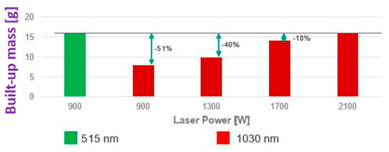 - Fu, E.; Spiegelhalder, R.; Vogt, S.; Goebel, M. The Best Kept Secret in Laser Additive Manufacturing: Green Lasers, a Unique Innovation. In Proceedings of the Laser 3D Manufacturing IX, San Francisco, CA, USA, 22–27 January 2022; SPIE–International Society for Optics and Photonics: Bellingham, WA, USA, 2022; pp. 1–6. [Google Scholar]