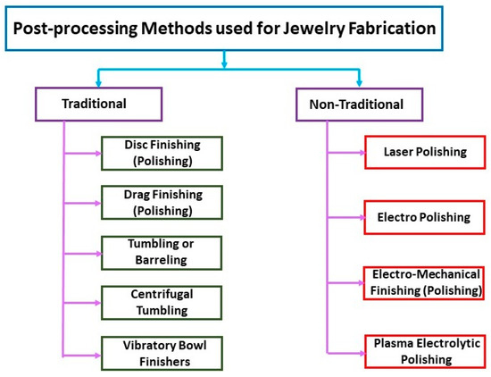 Even though plenty of manufacturing processes are available for making jewelry components, additive manufacturing processes are preferred to subtractive manufacturing processing to reduce material wastage. Additive manufacturing (AM) is also known as 3D printing, rapid prototyping, layer-by-layer manufacturing, digital manufacturing, or solid-free form manufacturing processing, and it is used for the fabrication of intricate geometries from 3D model data [1]. AM was developed as a potential tool of fabrication as compared to the traditional manufacturing (TM) method because it has design flexibility, customization features, the ability to create complicated shapes, and wastage reduction. This technology uses layer-by-layer printing to create items with robust mechanical quality [1,2]. According to ISO/ASTM 52900:2015(E), there are two main types of AM processes: (i) single-step AM processes and (ii) multi-step AM processes [3]. In the first case, independently of the techniques, the work material may achieve its fundamental form and expected qualities in a single phase. Layer after layer, parts in metal, polymer, and composite materials can be built up over time. The adhesion principle is generally used in multi-step AM processes to create the intended part geometry, and then additional stages are used to create the part’s desired qualities. For instance, it is possible that the geometry was first acquired through the joining of metallic, ceramic, and composite elements. They could go through further processes, like sintering or infiltration, to obtain the desired qualities later [4,5,6]. A thorough analysis of the AM process was provided by Parupelli and Desai, which focused on the recent advancements made by numerous researchers and industries. A summary of the features, benefits, and drawbacks of each AM printing method was reported and presented in their work. The key advancements in AM technology in various industries, including electronics, medical, aerospace, automotive, and construction industries, were also examined [7].
