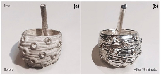 (a) “The Ojo” hand polished after 1 h stream finishing, (b) “the Ojo” series after mechanical and hand polishing and further stone setting, Reprinted with permission from ref. [10]. 2016 Springer Nature.