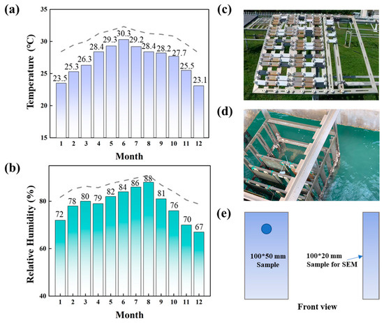Climatic data during the exposure period at Sanya station: (a) the average temperature for each month; (b) the average relative humidity for each month. Photos of the corrosion test equipment and samples in the (c) marine atmospheric zone and (d) marine immersion zone. (e) Schematic diagram of the size of the samples.