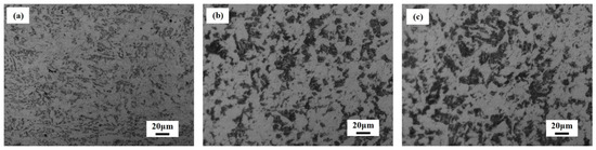 The metallographic structures of the three steels are shown in Figure 2. The metallographic structure of the three steels is mainly ferrite and a flake pearlite structure, and inclusions are distributed in them. At the same magnification, the morphology of the pearlite in steels #2 and #3 is greater than that in #1 steel.