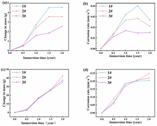 Mass changes and corrosion rates of the three steels at different time points for (a,b) atmospheric zone and (c,d) immersion zone.