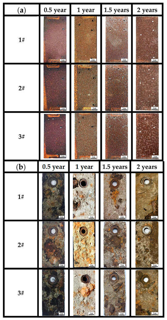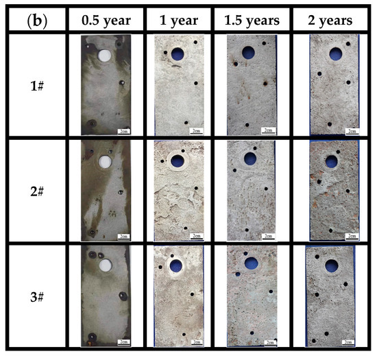 Figure 5a shows the macroscopic surface morphologies of the three steels in the atmospheric zones of actual marine environments for 0.5, 1, 1.5 and 2 years. Observations showed that in the 0.5-year period, the surfaces of the three steels were covered with dense rust. As time elapses, the color of the surface rust layer changes from reddish brown to dark red. From the macroscopic color change and surface condition, a preliminary judgment can be made, which qualitatively suggests that a uniform, dense rust layer formed on the surface of all three bridge steels. The macroscopic morphology of the three steels shows almost no difference at this time.