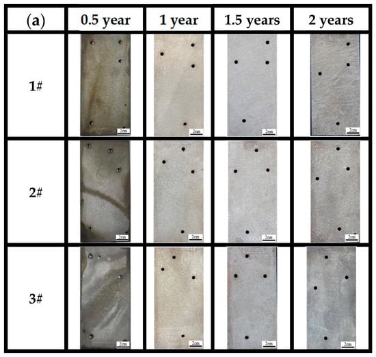 After completely removing the corrosion products (Figure 6a), it can be observed that the three bridge steels exhibit relatively light corrosion in the marine atmospheric environment. During the corrosion periods of 0.5 years, 1 year, and 1.5 years, no visible corrosion pits are on the sample surfaces, and the surfaces are relatively smooth. The appearances of steels at the same time point cannot be directly distinguished with the naked eye. After 2 years of corrosion, however, numerous localized corrosion pits can be observed on the surface of steel 1# compared to steels 2# and 3#, suggesting that steel 1# is less corrosion-resistant. The surface of the steel 2# substrate is relatively rough, whereas the surface of the steel 3# substrate is comparatively smooth. The results indicate that higher contents of Ni, Cu, and Mo have a significant influence on corrosion resistance compared to general low-alloy steels and weathering steels in tropical marine atmospheric environments.