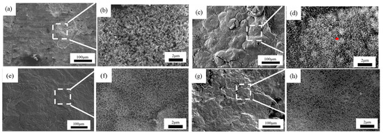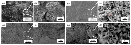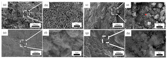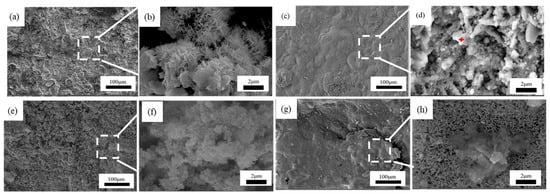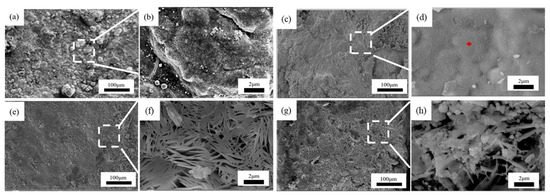 Microscopic corrosion morphology of 3# steel in atmospheric zone at different times: (a,b) 0.5 years and its high magnification micrograph; (c,d) 1 year and its high magnification micrograph with the feature of needle-like corrosion products (red plus sign); (e,f) 1.5 years and its high magnification micrograph; (g,h) 2 years and its high magnification micrograph.
