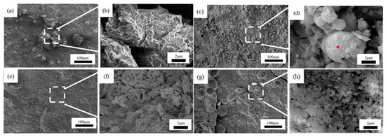 Microscopic corrosion morphology of 1# steel in immersion zone at different times: (a,b) 0.5 years and its high magnification micrograph; (c,d) 1 year and its high magnification micrograph with the feature of spherical corrosion products (red plus sign); (e,f) 1.5 years and its high magnification micrograph; (g,h) 2 years and its high magnification micrograph.