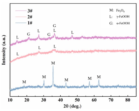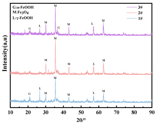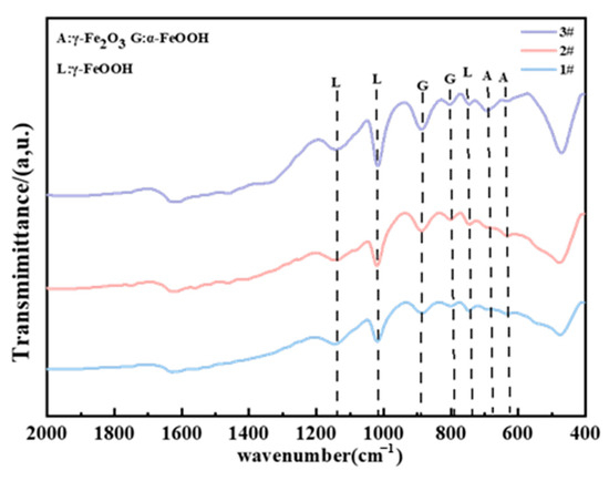 XRD and FTIR were utilized to analyze the composition of the rust layers. The XRD spectra of the corrosion products of three steels exposed to the marine atmospheric environment for 0.5 years are shown in Figure 13. It can be observed that, in the early stages of exposure, due to the limited amount of collectible corrosion products and the presence of amorphous phases, the phase results in the XRD spectra are not very distinct. Nevertheless, Fe3O4 was clearly detected in steel 1#, while the rust layer products of steel 2# mainly comprised γ-FeOOH. In steel 3#, both α-FeOOH and γ-FeOOH were present. It is generally believed that lepidocrocite (γ-FeOOH) tends to first be formed on the steel surface at the early stage of corrosion [16,23]. The formation of lepidocrocite occurs in low Cl⁻ concentration environments, where iron (Fe) first dissolves to form ferrous ions (Fe2⁺), which are subsequently oxidized and precipitated. As we know, γ-FeOOH has poor thermodynamic stability. According to the theory proposed by Misawa et al. [28], γ-FeOOH may gradually transition to α-FeOOH in a low Cl− concentration environment. α-FeOOH exhibits a high stability and almost has no further phase transformation [14,29]. Therefore, in the early stages of exposure, when the Cl− concentration is relatively low, the two types of weathering steels tend to form more compact and protective corrosion products, with both γ-FeOOH and α-FeOOH having small and similar molar volumes. In contrast, the Fe₃O₄ detected in steel 1# is likely transformed from the initial γ-FeOOH. The phase transformation from γ-FeOOH to Fe3O4 involves a large change in molar volume, expanding by 98.9% [13,30]. Consequently, the compactness of its corrosion product layer is relatively poor, which is why its corrosion rate exceeds that of the two weathering steels. In the FTIR results of different steels in the atmospheric zone after 2 years (Figure 14), Fe2O3 was detected in all three steels, which should be transformed from Fe₃O₄ through a further solid oxidation process [30]. The decrease in the intensity of the peaks associated with amorphous substances indicates that the corrosion products gradually stabilize over time.