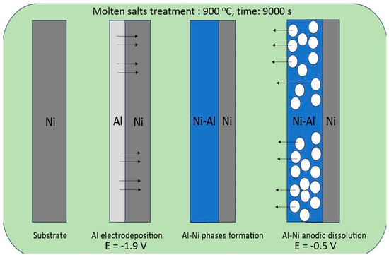 In this study, we applied a molten salt treatment on a nickel plate to fabricate porous Ni electrodes. The surface development level of the obtained porous structures was strongly connected with selected deposition/dissolution potentials and the temperature of the molten salt electrolyte during the formation of alloys. The mechanism of the formation of porous structures was related to the reaction between electrodeposited aluminum and the substrate material. A schematic plot of the molten salt treatment, along with the deposition/dissolution process, is presented in Figure 1.