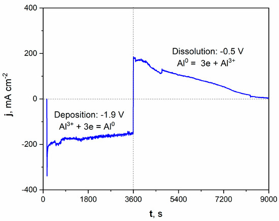 The registered current density during the potentiostatic porous layer formation is graphically presented on the left part of the plot. Applying a potential of −1.9 V increased the cathodic current density, oscillating around a value close to −200 mAcm−2 during deposition. The deposition of Al from molten salts can be expressed by Equation (4):
