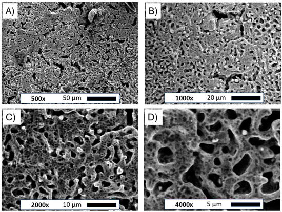 SEM images of the Ni porous electrode obtained by molten salt deposition/dissolution of Al. Figure captions and magnifications: (A)—500×, (B)—1000×, (C)—2000×, (D)—4000×.