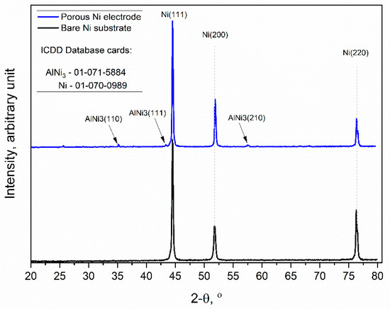 The pictures clearly show the changes in the structure of the nickel plate. The smooth bulk metallic surface was modified to form an irregular porous foam. The average size of formed holes ranged between 5 and 10 µm. The observed porous body was also covered by many smaller voids evenly distributed across the metallic foam. Such small defects on the electrode surface can be attributed to the Kirkendall effect between metallic Ni and molten Al deposited on the electrode surface, which forms intermetallic phases under such high temperatures [25]. Similar structures were observed in previously published works for Ni-Co and Ni-Pt alloys [20,21]. The unmodified and porous Ni electrode was subjected to X-ray diffraction examination, as shown in Figure 4.