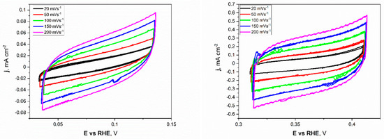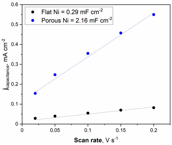Electrochemical investigations of the Ni unmodified and porous electrodes began with the electrochemical double-layer capacitance (Cdl). Estimating the electrochemically active surface area (ECSA) is a more appropriate metric for assessing effective catalytic evaluation. As mentioned before, the measurements were conducted for a narrow electrochemical window, 0.05 V vs. OCP value, at different applied sweep rates. As presented in Figure 5, the non-faradaic region for porous Ni electrodes in 1 M NaOH was slightly shifted to more positive potentials (range from +0.32 to +0.42 V) compared to the unmodified Ni plate.
