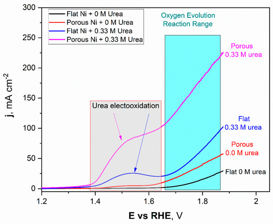 Generally, the most common value for ECSA determination in 1 M NaOH solution is a capacitance of 40 mFcm−2. The obtained ECSA values for flat Ni and porous Ni were 7.25 cm−2 and 54 cm−2, respectively. These results show that the catalytic activity for modified Ni can be associated with a higher number of defects and other areas on the electrode, characterized by lower overpotential in electrochemical measurements than in the case of unmodified porous Ni. To confirm these findings, linear voltammetry scans (LSV) in 1 M NaOH electrolyte with and without the addition of 0.33 M urea were performed and plotted in Figure 7.