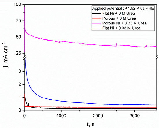 The porous Ni electrode, with significantly more developed surface area, was able to reach a current density of +95.3 mAcm−2 at the maximum at a potential of 1.62 V, where the oxygen evolution reaction was not present yet. Moreover, for the porous Ni electrode, the registered current density did not form the shape of a peak, as can be seen for the unmodified sample. In the potential range of 1.53–1.61 V, the visible change slope of the curve could be registered, and diffusional transport of the reaction products occurred around the interface region. The comparative analysis of the obtained results shows that the porous Ni electrodes exhibited at least three times higher current density values, corresponding to the urea electrooxidation reaction, than non-modified samples. The stability of the tested electrodes was assessed in chronoamperometric tests with an applied potential of +1.52 V, which was selected according to the LSV measurements.
